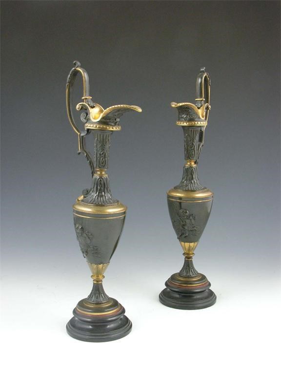 A pair of French gilt brass and patinated bronze ewers, of tapering form, decorated with cherubs on turned black marble bases, late 19th century, 15.75in (40cm) h. (2)