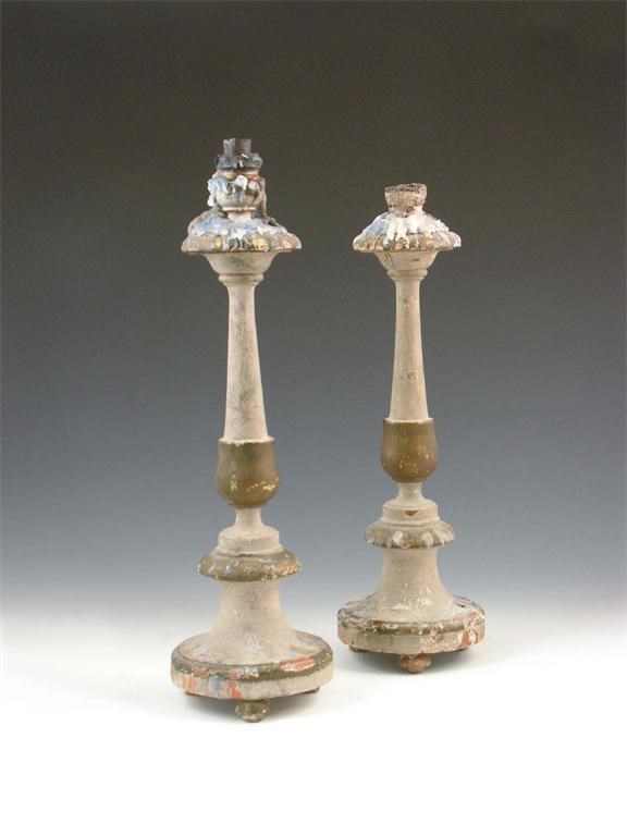 A pair of European turned wood and painted candlesticks, 17.5in (44.5cm) h. (2)