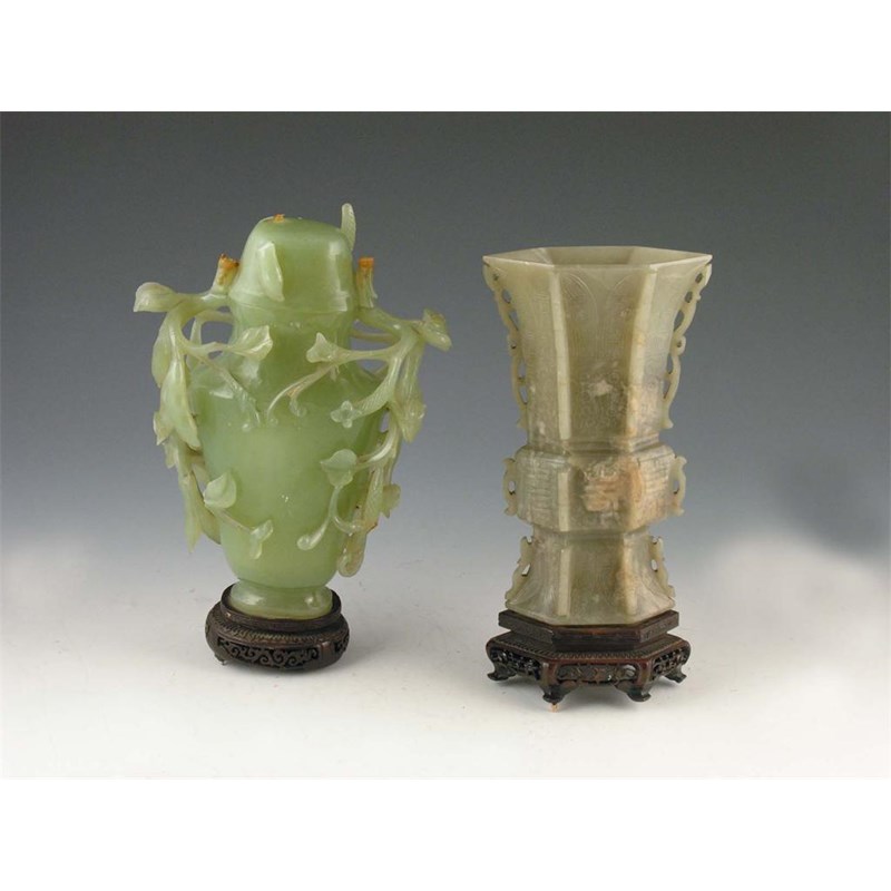 Two Chinese hardstone vases, one of archaic gu shape, the other entwined with foliage, on pierced hardwood bases, lamped, 11in (27.8cm) h, 7in (17.7cm) w. (2) Damages, with shades.