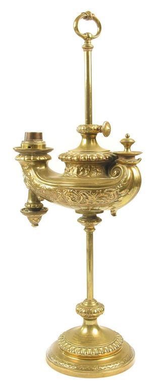 A late Victorian brass adjustable colza table lamp, with presentation inscription dated '1901', 21.5in (54.5cm) h.