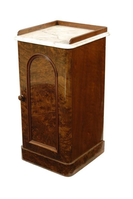 A Victorian walnut pot cupboard, the moulded edge marble top with a 3/4 gallery above an arched panelled door, 33in (83.5cm) h, 16.5in (42cm) w, 17in (43cm) d.
