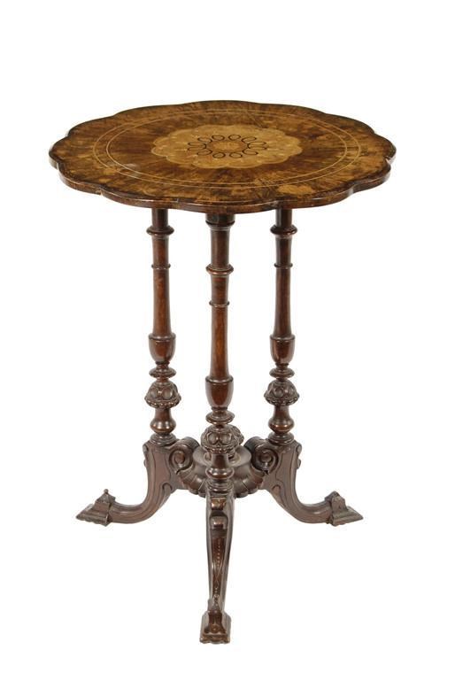 A late Victorian walnut and marquetry tripod table, the circular lobed top on turned urn columns and scroll supports, 28.25in (71.5cm) h, 21in (53.4cm) dia.