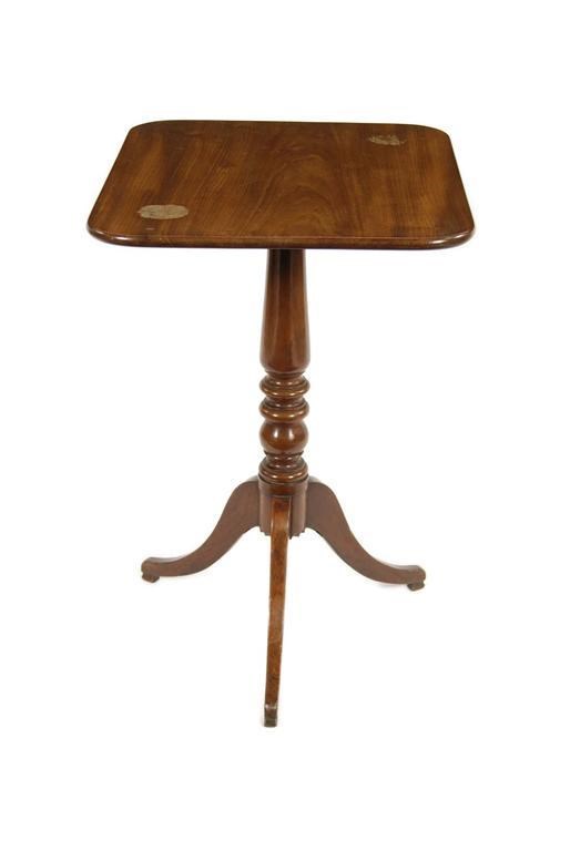 An early 19th century mahogany tripod table, the rectangular tilt-top on a turned stem and downswpet legs, 29in (73.3cm) h, 22.75in (58cm) w, 19in (48cm) d.