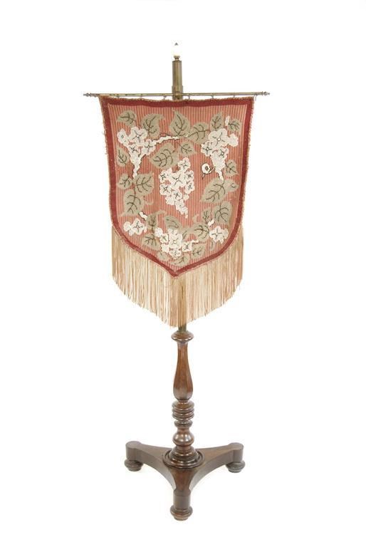A Victorian rosewood and brass pole firescreen, with a shield shape beadwork banner, 50in (127cm) h, 18.75in (47.5cm) w.