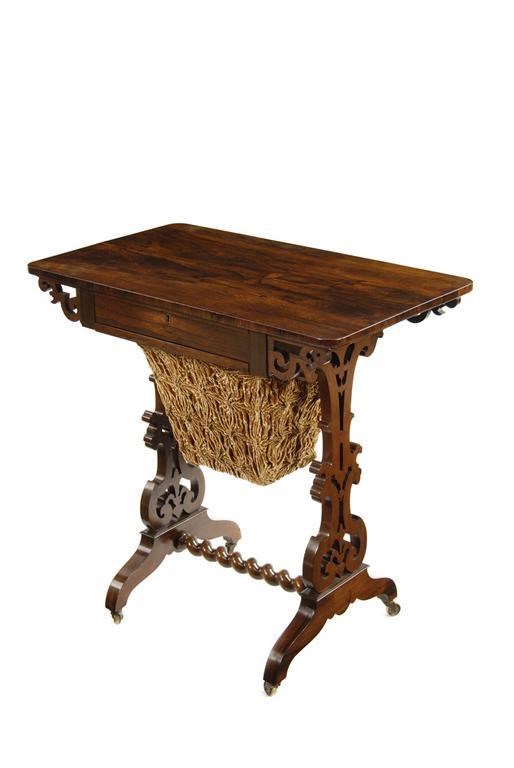 An early Victorian rosewood work table, with a frieze drawer and a pull-out bag, on pierced scroll ends united by a spiral twist stretcher and brass castors, 30in (76cm) h, 29.75in (75.4cm) w, 17.5in (44.1cm) d.