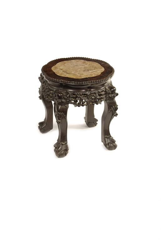 A Chinese hardwood low stand, the inset marble top above a leaf and berry carved and pierced frieze, on claw and ball feet, 15in (38.2cm) h, 13.5in (34cm) w.