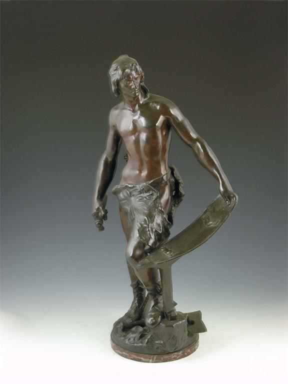 Andre Paul Arthur Massoulle (1851-1901). Le Travail, bronze, the base signed 'A. Massoulle', on a circular marble base, 25.5in (64.5cm) h, 13.5in (34cm) w.