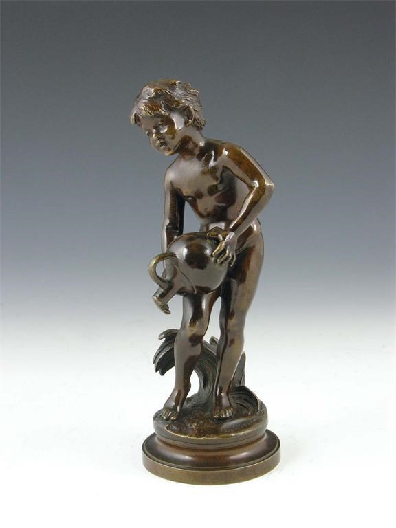 After Auguste Moreau (1834-1917). A bronze figure of a young boy pouring a pitcher of water, on a naturalistic base signed 'a. moreau', late 19th / early 20th century, 8in (20.2cm) h, 3in (7.4cm) w.