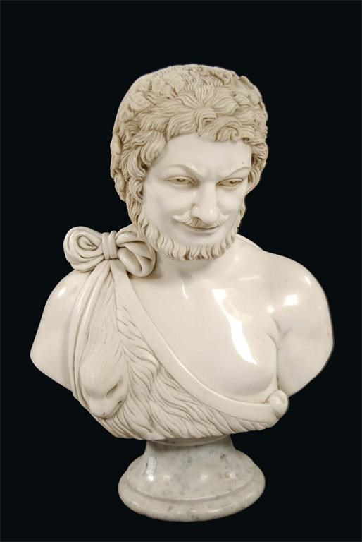 A carved marble bust of Bacchus, wearing his lion pelt, on a turned socle, 24.75in (62.6cm) h, 17.5in (44.3cm) w.