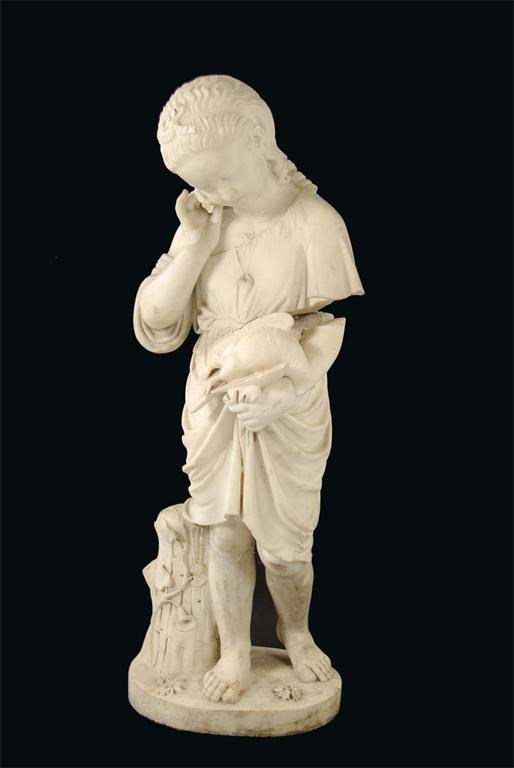 A 19th century carved white marble figure of a girl, holding a dead bird and standing on a naturalistic base, 38.25in (97cm) h, 14in (35.5cm) w, 9.25in (23.3cm) d. Losses, damages and repairs.