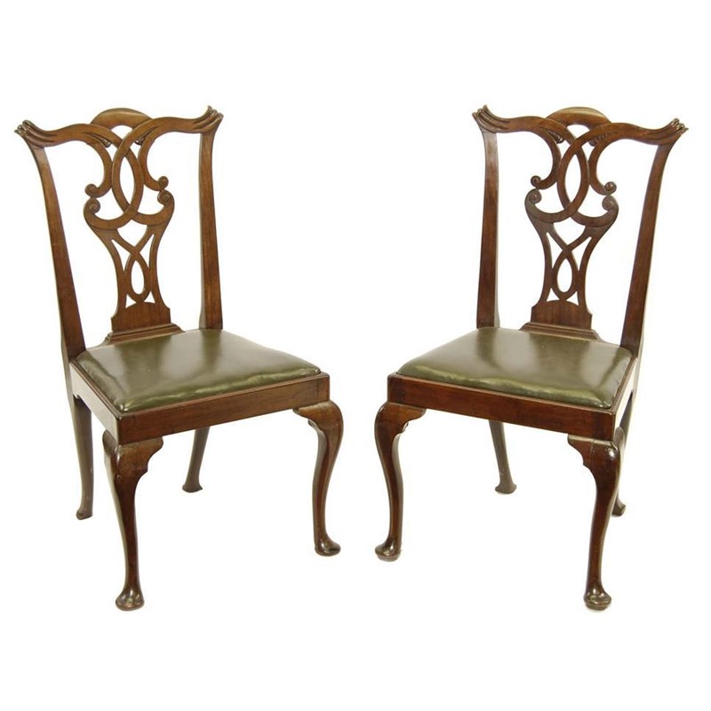 A pair George III mahogany dining chairs, each with an eared top rail to a pierced and interlaced splat, the drop-in seat to cabriole legs and pad feet. (2)