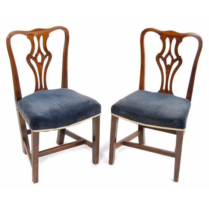 A pair of George III fruitwood side chairs, each with a pierced vase shape splat to a stuffed-over seat on moulded front tapering legs. (2)