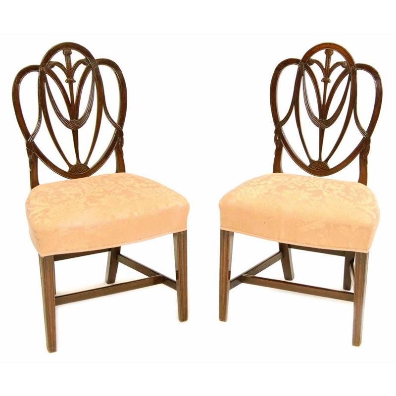 A pair of George III Hepplewhite style mahogany side chairs, each with a pierced and interlaced heart shaped back carved with plumes of feathers and drapes, to a stuffed over-seat and moulded square tapering legs united by 'H' stretchers. (2)