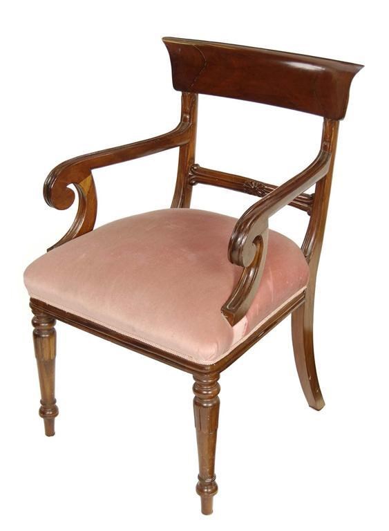 A Victorian mahogany open armchair, the curved top rail to scroll arms and tapering front legs.