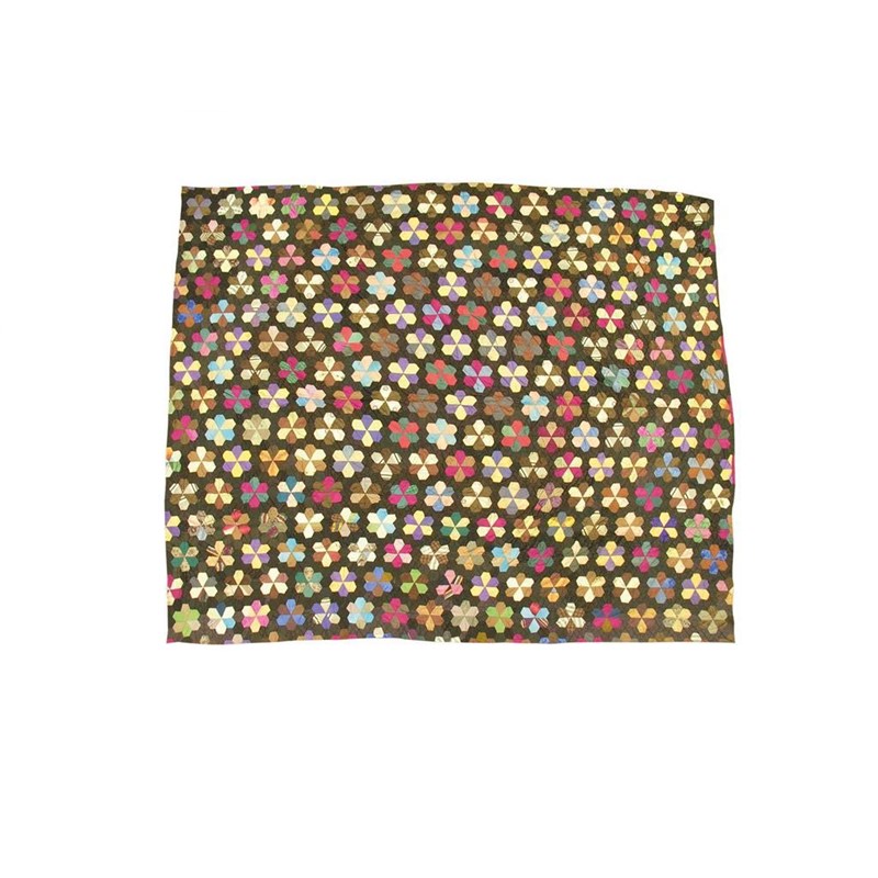 A late Victorian silk patchwork quilt, with allover six petal floret design to a black ground and brown border, c.1880, 97.5 x 93.5in (248 x 238cm).
