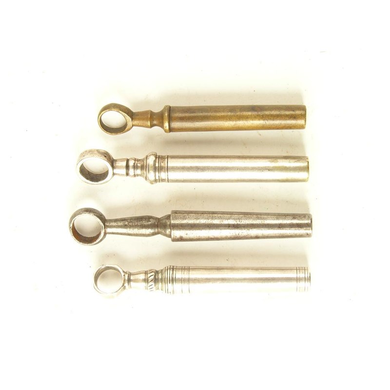 Four picnic corkscrews; including a silver example with a faceted ring and grooved helix, the banded case with maker's mark DF; a plated, a brass and a steel example. (4)