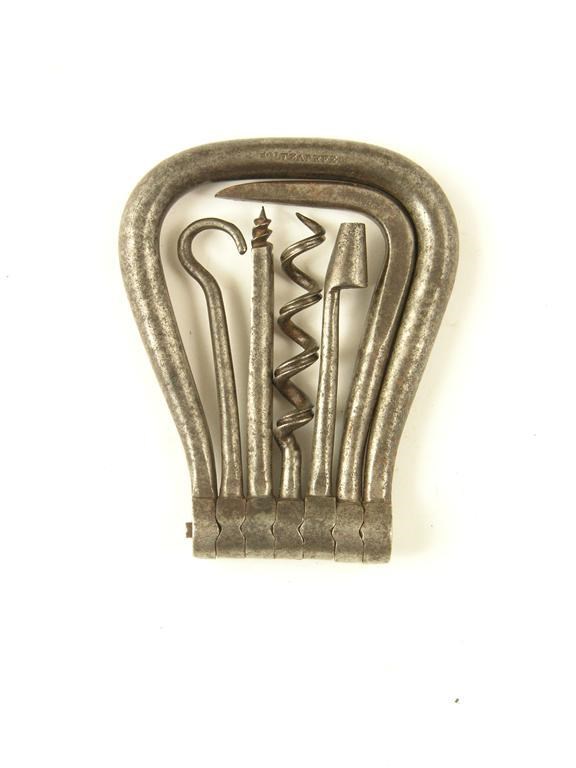 A 19th century steel folding bow, marked HOLTZAPFFEL, with five tools including a corkscrew with a grooved helix.