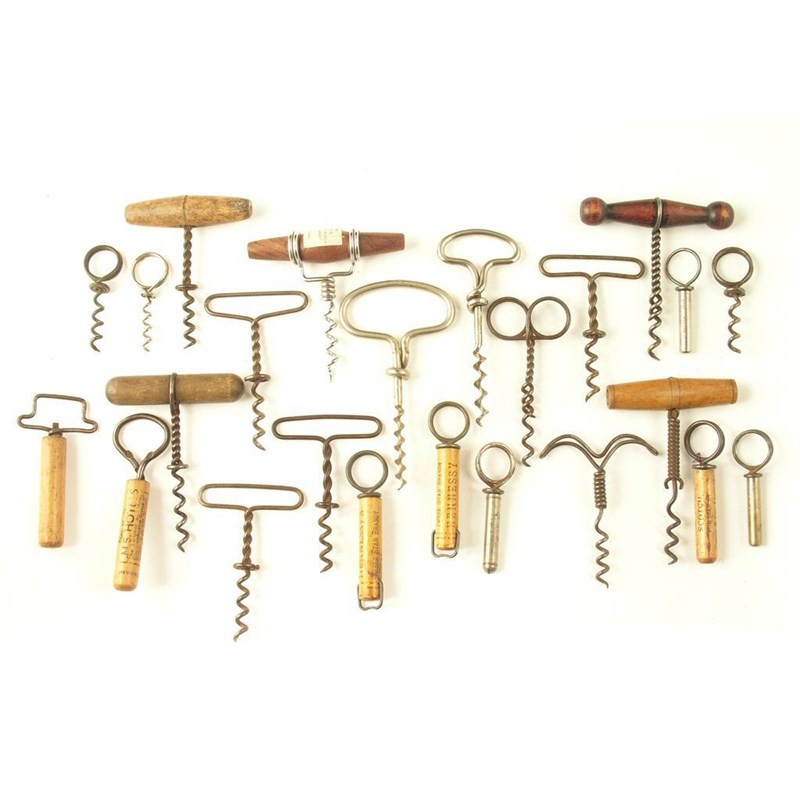 Clough corkscrews; including four picnic with wooden sheaths, one marked RD NO 718950 with plain sheath; three with metal sheaths, two marked; an 1899 patent with mahogany stained handle; two with button and wooden handles; another wood handle; a modern Indian example; eleven wire examples. (24)