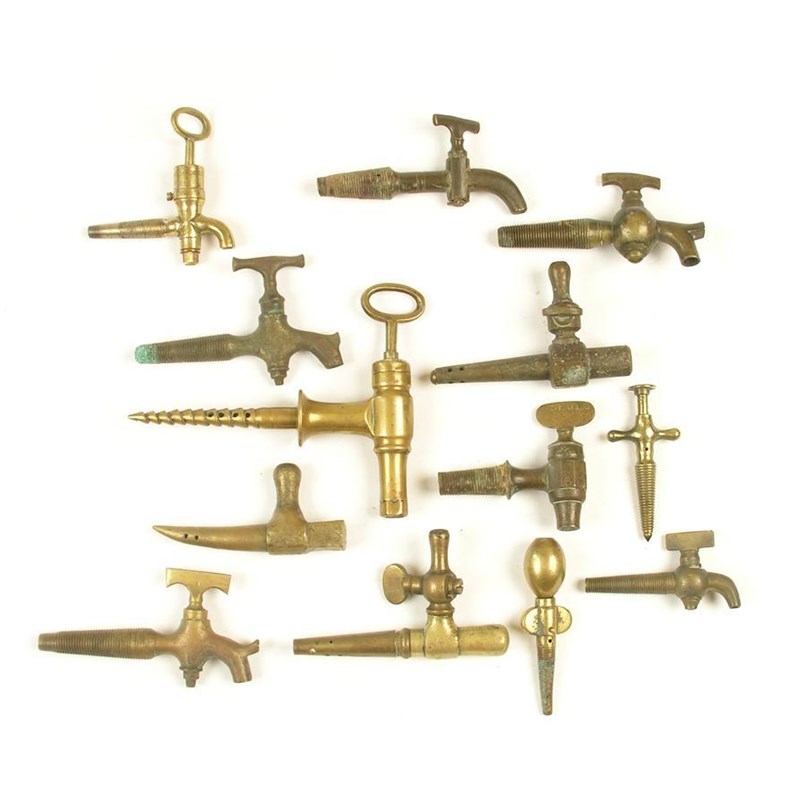Eleven taps, including; a brass example with key and archimedean screw, marked F.S.; another brass with key, Farrow & Jackson; one plain by Gaskell; eight other taps and two brass air vents. (13)