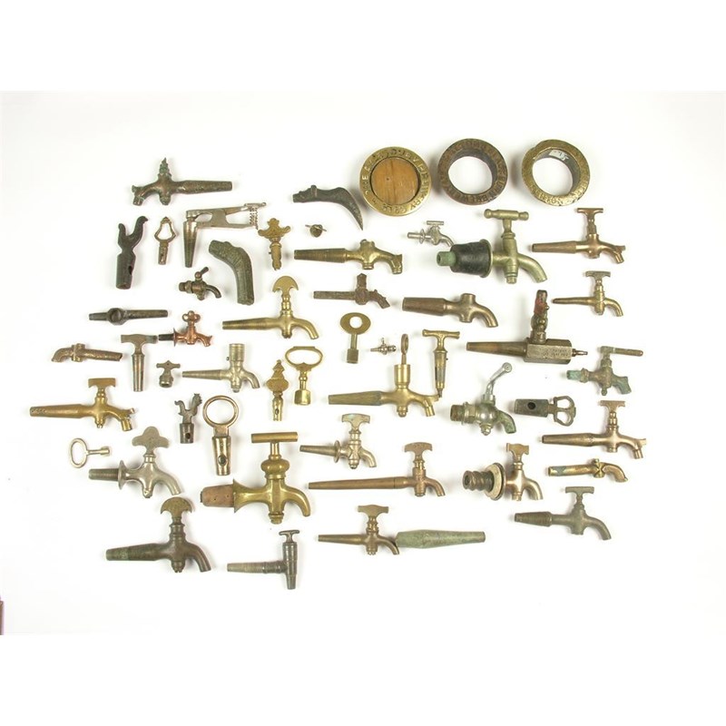 Ten brass taps and fifteen other taps; a Mann Crossman & Pauline Ltd vent; three brass barrel bung frames, marked Aylesbury Brewery Co Ltd, Dutton Blackburn Brewey Ltd, Bissell & Son Coopers Netherton; and various part spigots, taps, keys. (51)