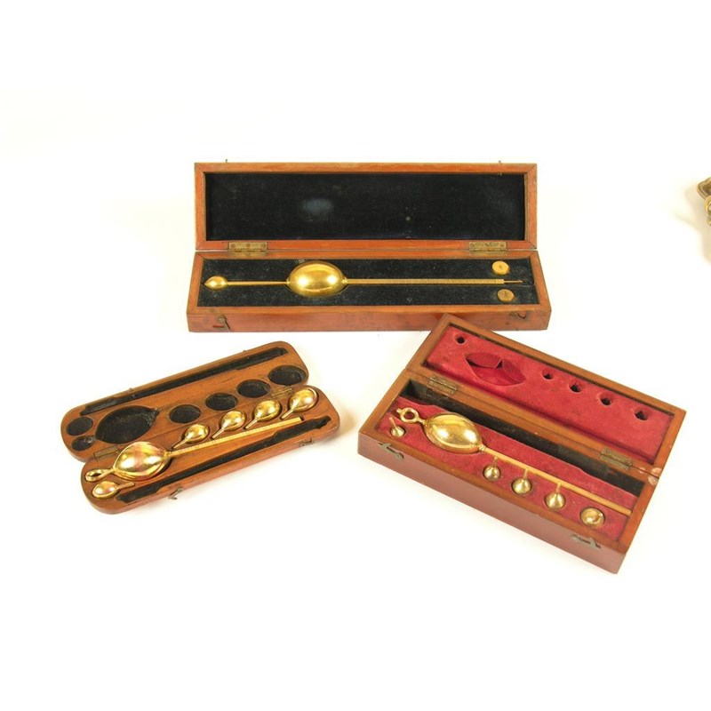 A brass Bates Saccharometer, by Griffin & Tatlock Ltd, London, in fitted mahogany case; another marked L. OERTLING LTD LONDON E.C., the mahogany case marked a crown above 1981 ER, both thermometers missing; a brass hydrometer marked John B. Everall, LONDON No.149, in a fitted case. (3)