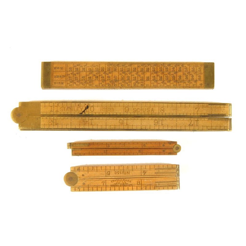 A rare Milliners boxwood slide rule, marked CHRISTIS LONDON; a four fold boxwood and brass edged 24 inch rule, by Stanley, No.32 1/2 SC USA; and two 12 inch four fold rules. (4)