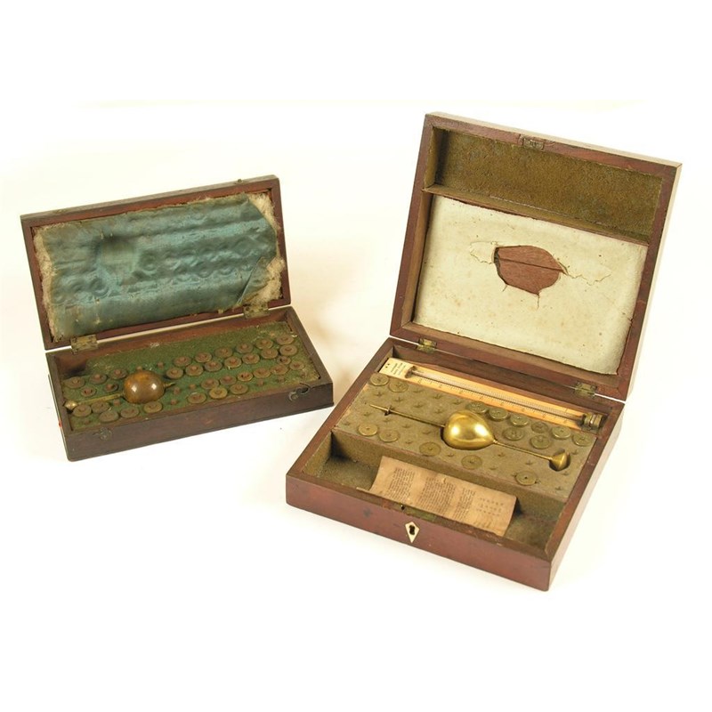 Gamage, late Dicas, Liverpool. A brass hydrometer, marked A.DICAS PATENTEE, with ivory thermometer, with weights, in a fitted mahogany case, the strung cover inset a plaque marked A. DICAS, PATENTEE LIVERPOOL 5461; A Clarkes Export brass hydrometer, thermometer missing, in a fitted mahogany case, marked CLARKES EXPORT HYDROMETER MADE ONLY BY DRING & FAGE, MAKERS TO HIS MAJESTY'S HONORABLE BOARD OF EXCISE No 20 TOOLEY ST NEAR LONDON BRIDGE No 13275. (2)