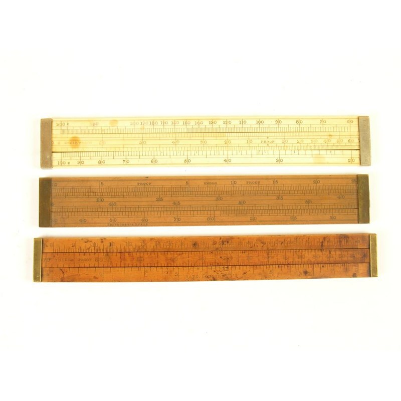 An ivory proof slide rule, by Buss, 33 Hatto Garden, London; a boxwood proof slide rule by Bate, London and another marked with fleur de lis trade mark. (3)