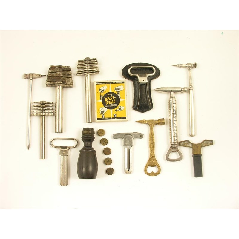 Five cork extractors; one with a cap lifter marked HALL'S WINE THE SUPREME TONIC; three cork cutters; an ebonised wood bottle seal, marked E.HALL WHEATSHEATH, GREENWICH, with buttons for PORT, BRANDY, SHERRY, WHISKEY, GIN, RUM; four ice hammers, one with corkscrew and cap lifter marked P.H.V. & Co. (13)