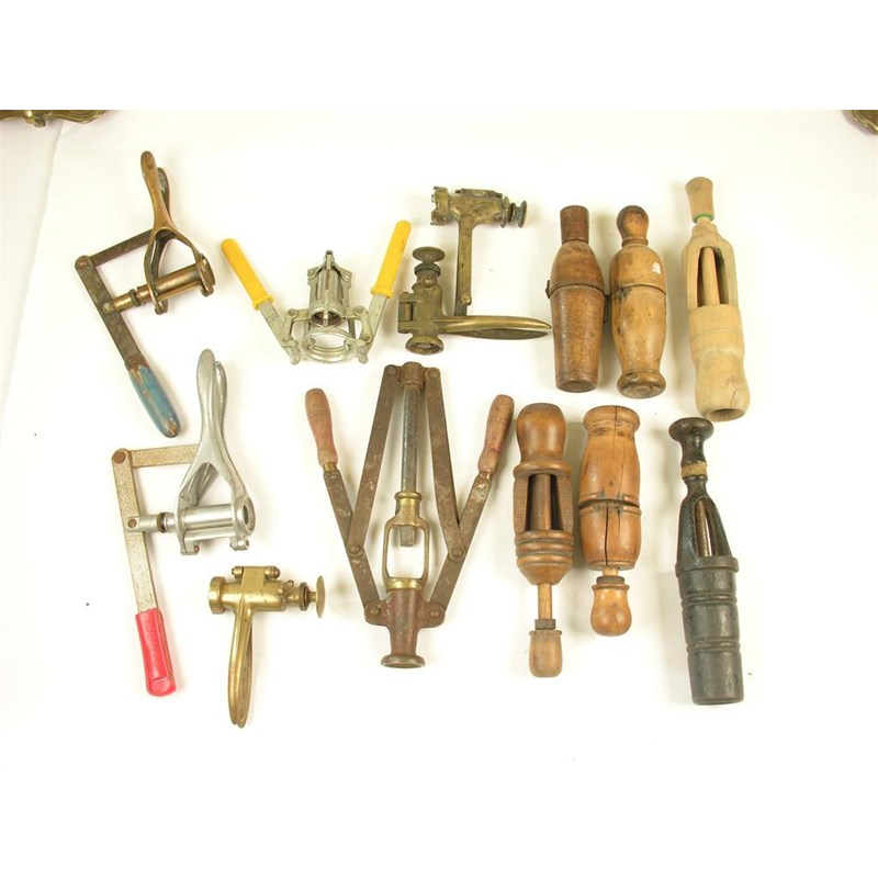 Five turned wood corking machines; another ebonised with a cast iron support and handle; a French brass and iron double lever corking machine with a brass plaque marked LE BOUCHOIR PARISIEN BTE S.G.D.G B.F. PARIS; three other lever types; and three brass grip types. (13)