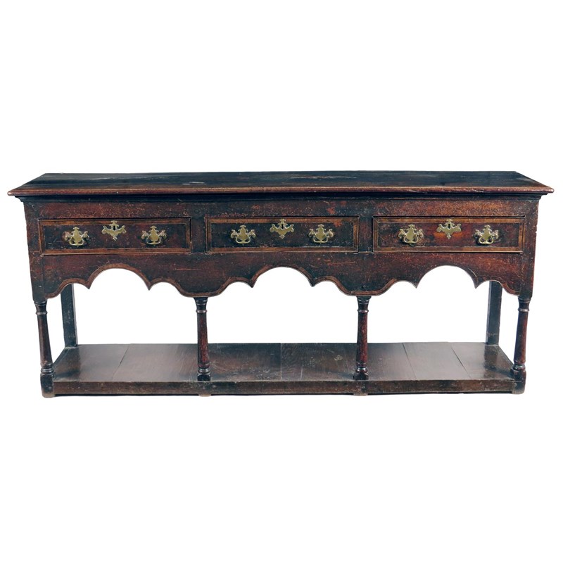 A George III oak pot-board dresser, with mahogany banding, the boarded top above three drawers and a serpentine edge apron on turned column legs, 80cm high, 190.5cm wide, 45cm deep.