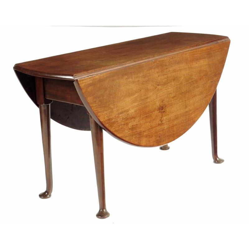 A George II mahogany dining table, the oval drop-leaf top on club legs and pad feet, 69.4cm high, 121 x 126 (open).