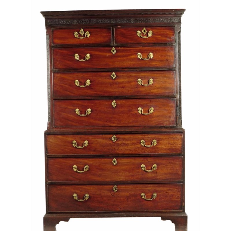 An early George III mahogany chest on chest, the dentil cornice above a blind fretwork carved frieze and two short and three long graduated drawers flanked by blind fretwork anted angles, the base with three long graduated drawers, all fitted with gilt brass rococo style handles and escutcheons, 182cm high, 117cm wide, 59.3cm deep.
