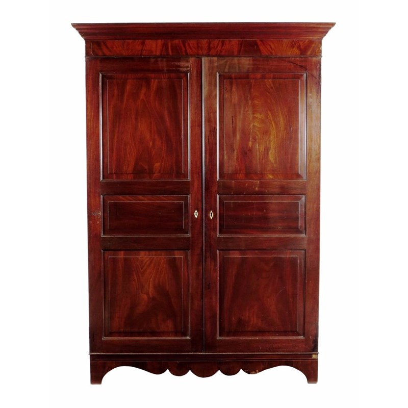 A George III mahogany Channel Islands wardrobe, with a moulded cornice above a pair of fielded panelled doors enclosing a later rail with bone escutcheons and on wavy edge bracket feet, 188.5cm high, 134cm wide, 59.2cm deep.