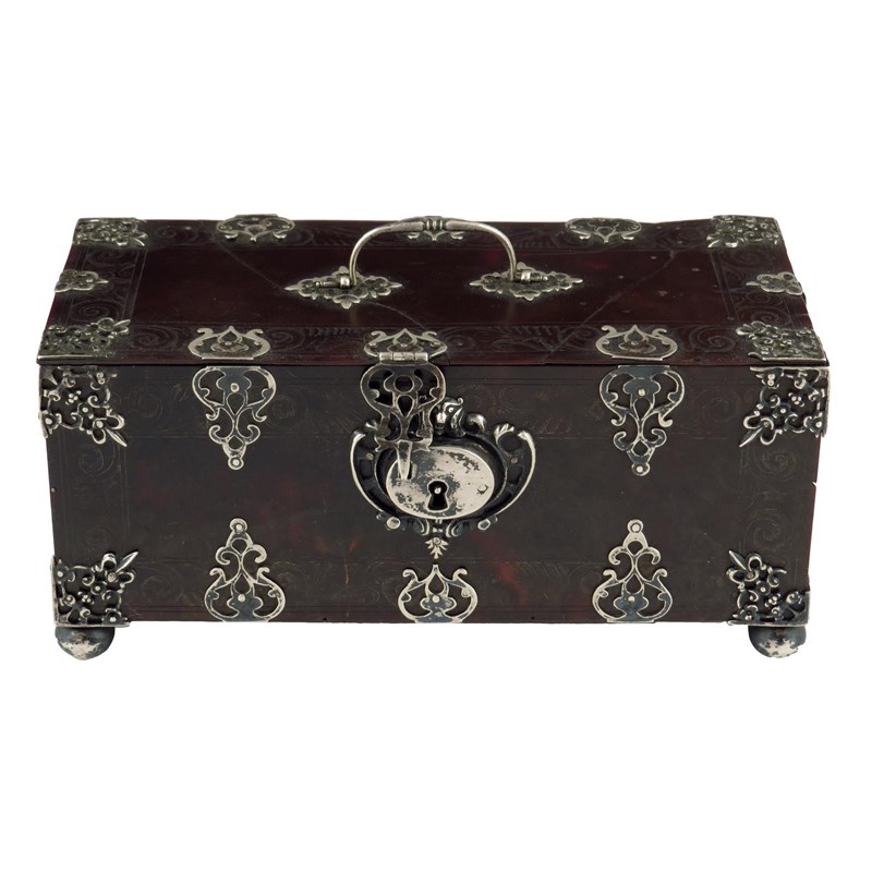 λ An 18th century continental tortoiseshell casket, with engraved borders and with cut steel strapwork mounts, the hinged lid with a swing handle above a bat's wing key escutcheon and with side ring handles on ball feet, 9.8cm high, 21.3cm wide.