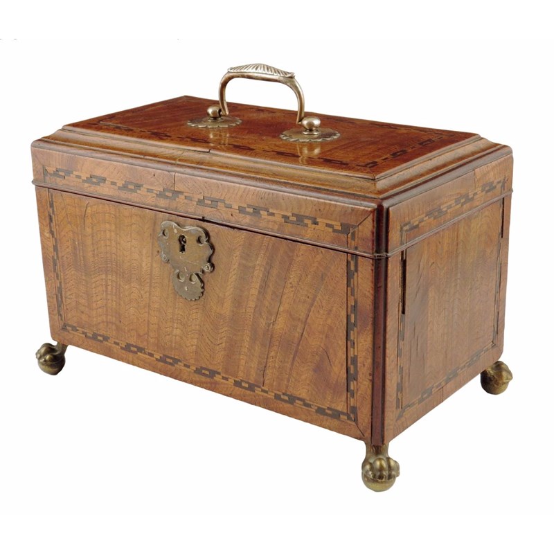 A George II oak tea caddy, inlaid with parquetry stringing and with moulded edges, the hinged lid with a leaf cast, silver coloured metal handle, the interior originally with divisions and with a raised spoon shelf, on brass paw and ball feet, 18.2cm high, 28.3cm wide.