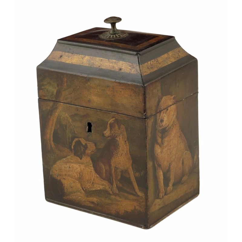 A rare tôle peinte tea caddy, painted with scenes of dogs in the manner of Landseer, with parcel gilt decoration, 15.3cm high. 10.1cm wide.