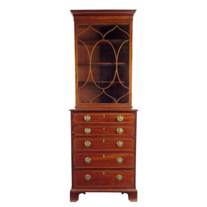 A late George III mahogany secrétaire bookcase, with satinwood and amaranth banding, the astragal moulded glazed door enclosing three adjustable shelves above a deep secretaire drawer fitted with pigeon holes and drawers above three further drawers, 214.1cm high, 74.7cm wide, 57.3cm deep.