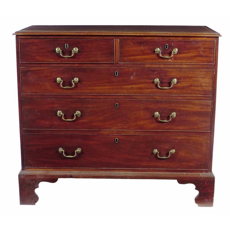 A George III mahogany chest, the crossbanded top inlaid with stringing above two short and three long graduated drawers, 98.5cm high, 110.6cm wide, 52.5cm deep.