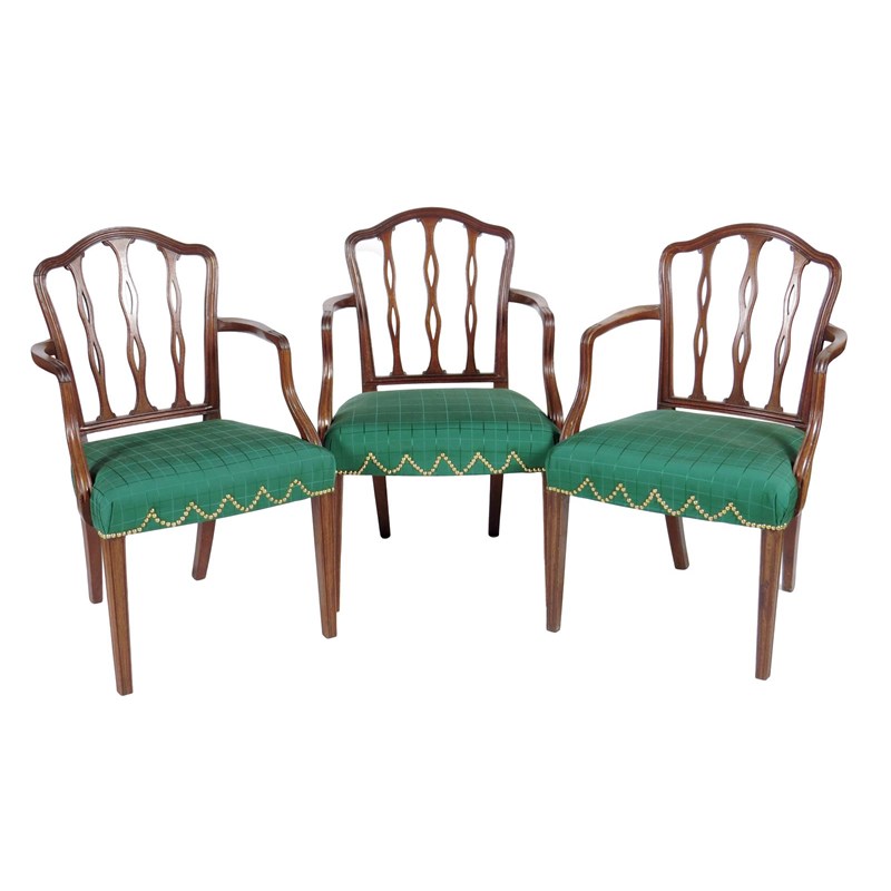 Three George III mahogany open armchairs, each with a triple pierced vertical splat back above a stuffed-over seat on moulded front legs, together with a pair of ebonised side chairs with matching green fabric seats. (5)
