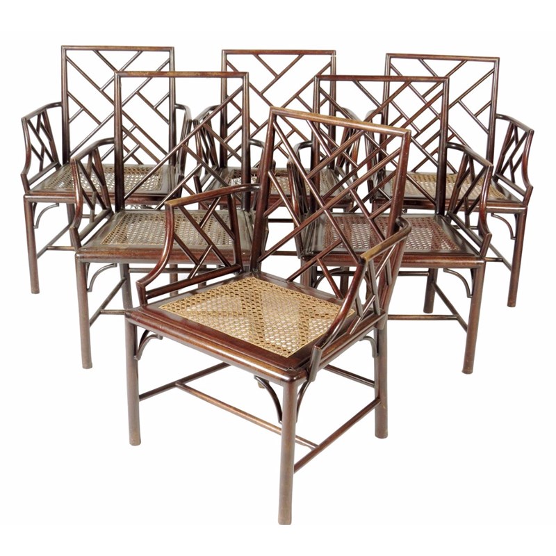 A set of six mahogany cockpen armchairs in George III style, each with a Chinese lattice style back and a cane seat, early 20th century, possibly by Whytock & Reid. (6)