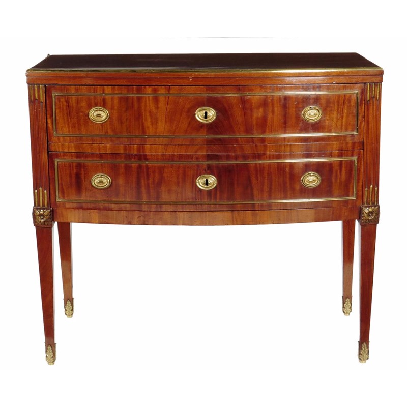 A 19th century Baltic mahogany and brass mounted bowfront commode, fitted with two drawers and flanked by stop fluted pilasters on square tapering legs and leaf cast sabots, 85.8cm high, 96.3cm wide, 52.5cm deep.