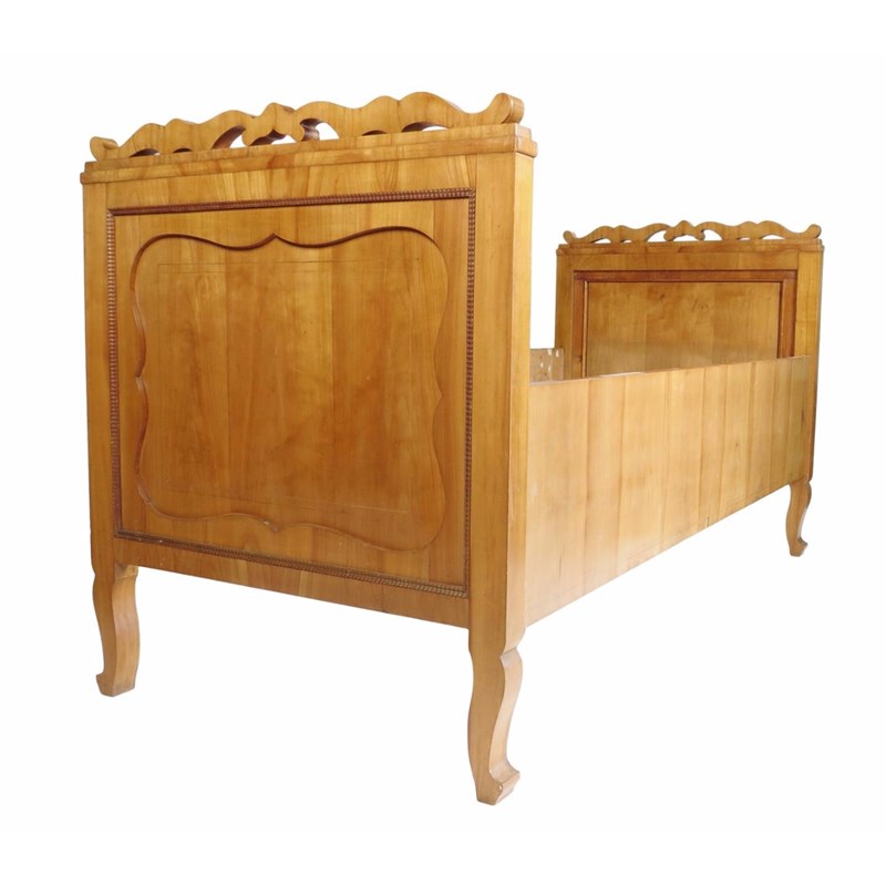 A Swedish Biedermeier style birch single bed, with scroll carved surmounts above arc d'arbelette panelled ends, 99cm high, 83.5cm wide, 190cm long.