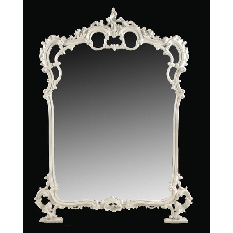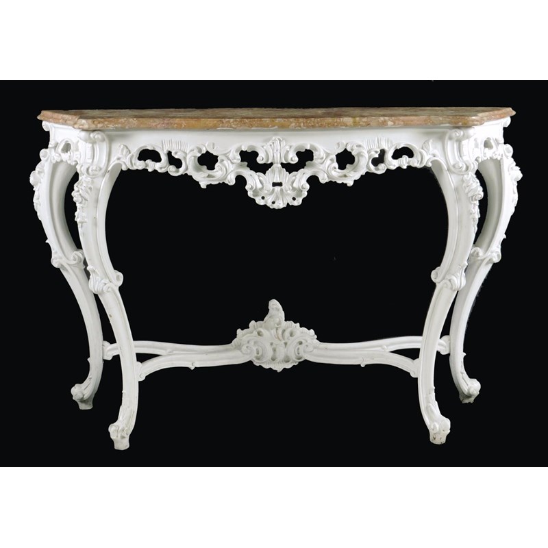 A white painted rococo style wall mirror, the shaped plate within a 'C' scroll and rocaille carved frame together with a matching console table, with a pink brèche marble top, the mirror: 156.5 x 121cm, the table: 88cm high, 136cm wide, 36cm deep. (2)