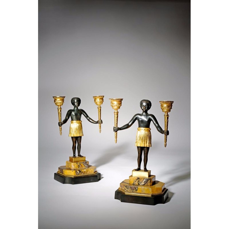 A pair of French gilt and patinated bronze candlesticks, each in the form of a standing Nubian boy holding a pair of torches on a Siena marble stepped plinth base, early 19th century and later, 28.2cm high, 17.5cm wide. (2)