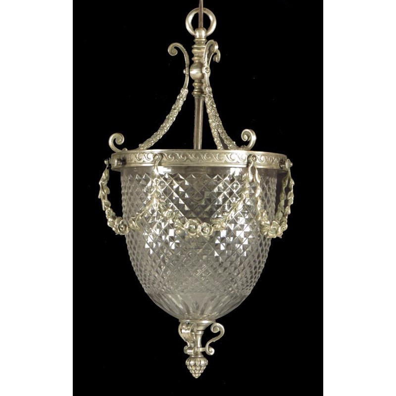 A plated brass and cut glass hall lantern in Adam style, the body hung with swags of flowers and with a bud pendant, with a single light fitting, 45.3cm high, 25.5cm wide.