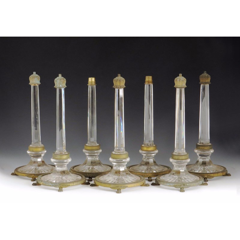 A set of seven late Victorian cut glass and gilt brass Clarke's patent 'Cricklite' candlestick bases, each with a faceted stem on circular bases with winged paw feet, stamped 'CLARKE'S CRICKLITE TRADEMARK' and with several numbers and letters, two finials missing, 33.3cm high. (7)