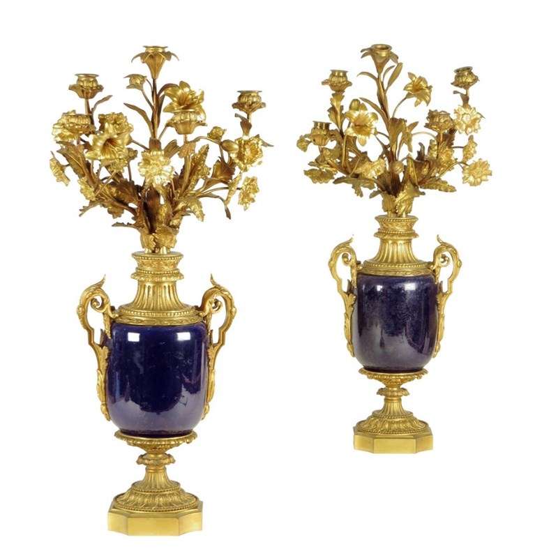 A pair of Napoleon III ormolu and porcelain candelabra in Louis XVI style, each with a royal blue body with scrolling leaf and beaded mounts with flowers and foliage and five lights, 63.8cm high. (2)