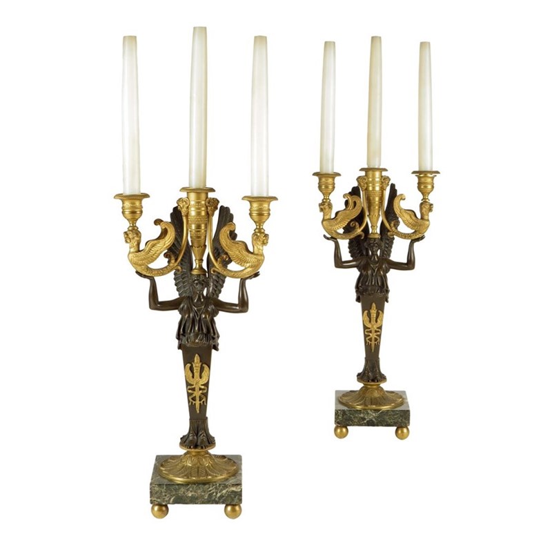 A pair of French gilt and patinated bronze candelabra in Empire style