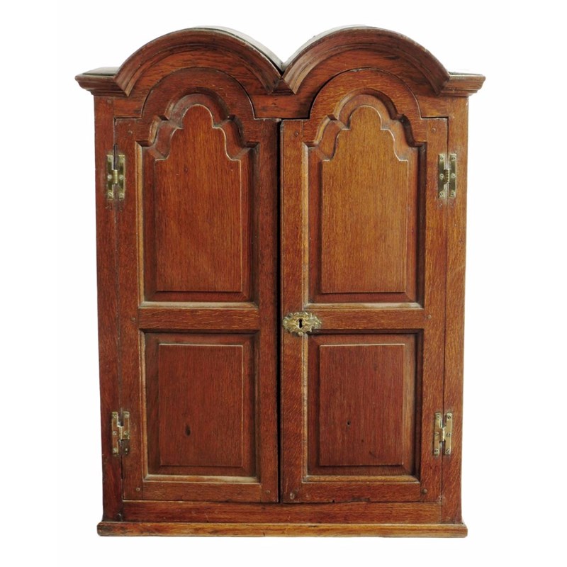 A mid 18th century oak cupboard, the double domed top above a pair of fielded panel doors enclosing a later painted interior with four shelves, 105.7cm high, 82cm wide, 33.5cm deep.